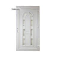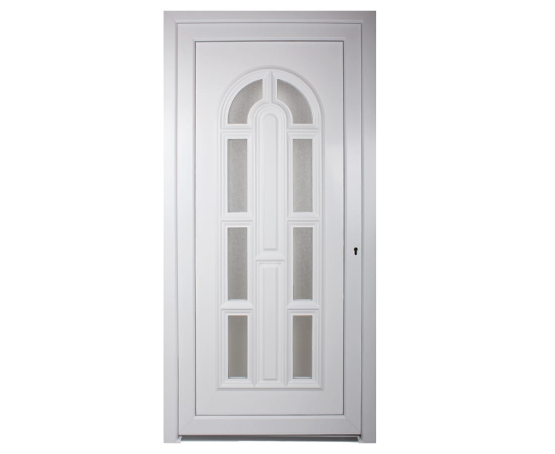 stilvollen und klassischen Eingangsbereich sorgt unsere weiße Kunststoff-Haustür England mit der Kombination aus markanter Ornament-504- Verglasung und den dekorativen Kassettennachbildungen.