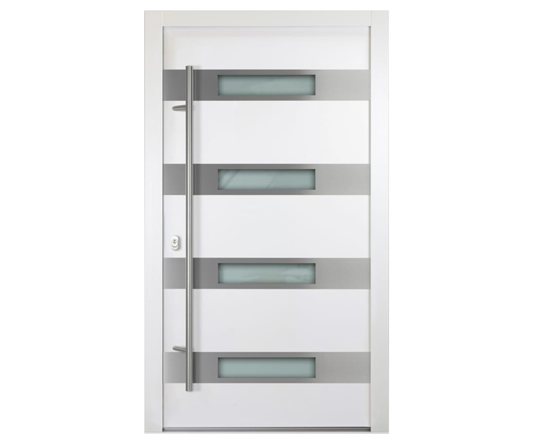 Eine ganz besonders moderne Optik erhält die Aluminium Haustür Finn durch das markante Streifenmuster, welches mit vier Edelstahl-Applikationen samt Lichtausschnitt erzeugt wird.