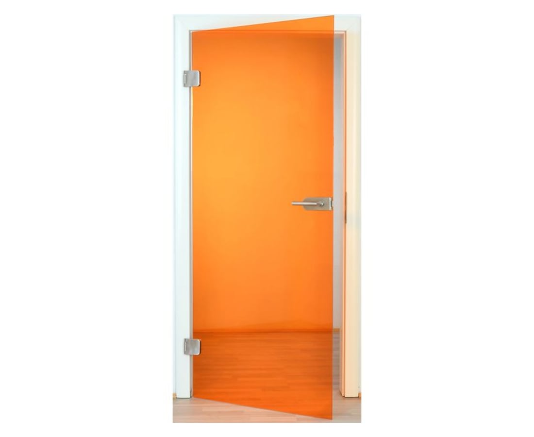 Die durchsichtige Glastür in Orange sorgt für eine besonders warme und freundliche Wohnatmosphäre und punktet darüber hinaus durch das VSG (Verbundsicherheitsglas) mit
