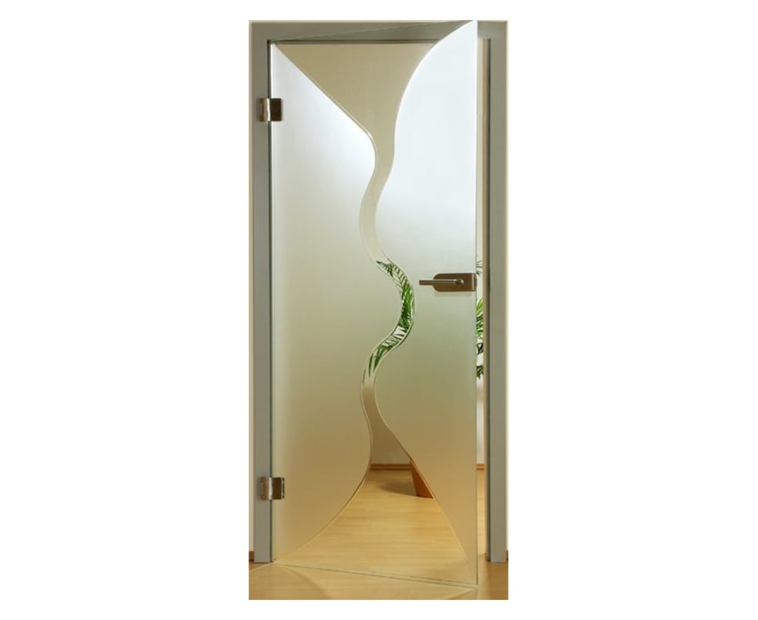 Geschwungene Formen charakterisieren unsere moderne Ganzglastür. Die Kombination von Klarglas innen und sandgestrahlten Formen außen, schafft ein ausgewogenes Verhältnis aus Sichtschutz und Helligkeit in Deinen Räumen.