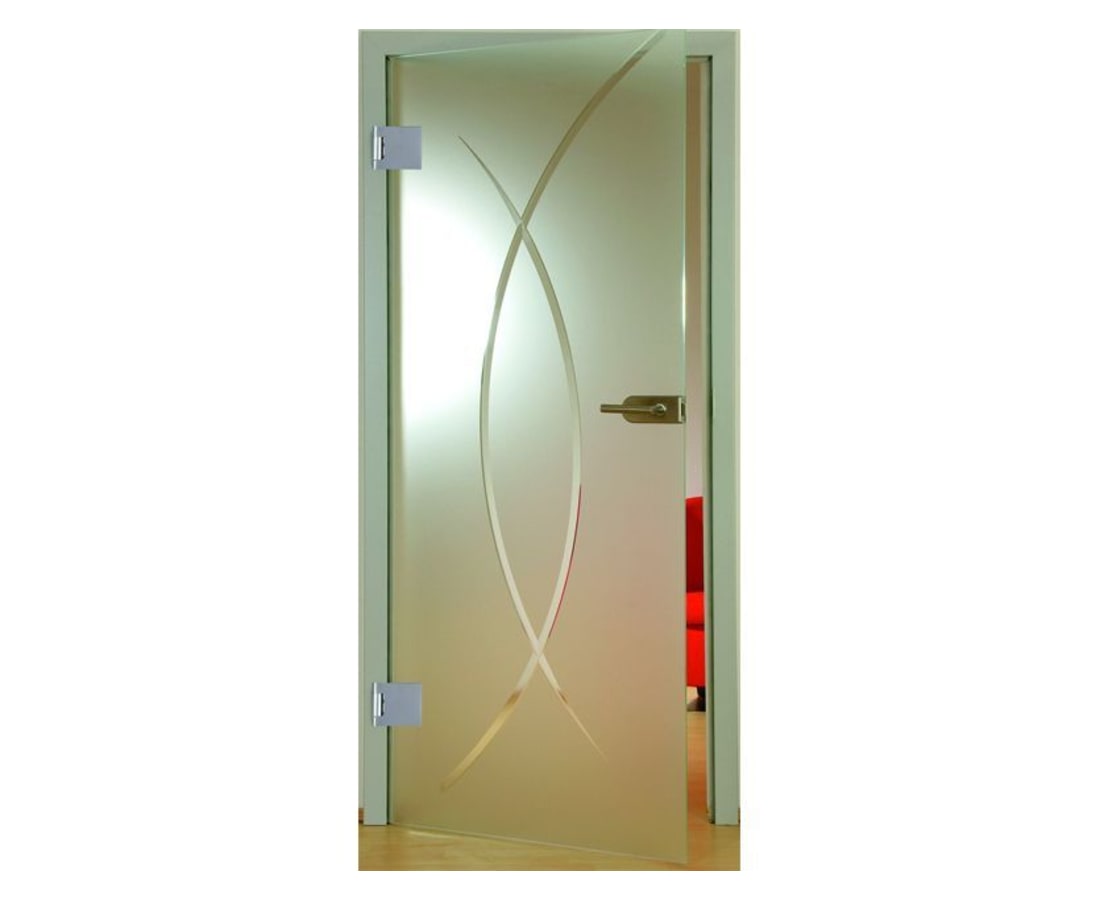 satinierte Ganzglastür erhält durch aufwendigen Rillenschliff eine besonders elegante Optik. Der Rillenschliff, in Form zweier sich schneidenden Kreisausschnitten, sorgt für ein besonders dekoratives Lichtspiel.