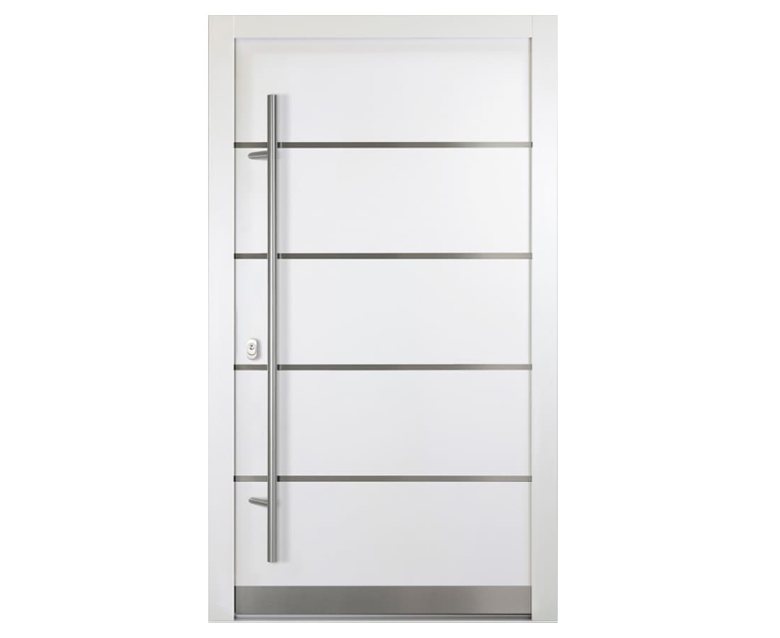 Unsere Aluminium-Haustür Milan überzeugt mit ihrer klaren Linienführung nicht nur durch eine besonders moderne Optik, sondern bietet Dir darüber hinaus auch Sicherheit, ausgezeichnete Wärmedämmwerte sowie eine lange Lebensdauer. Die Edelstahl-Querstreifen-Applikationen machen die Haustür zu einem